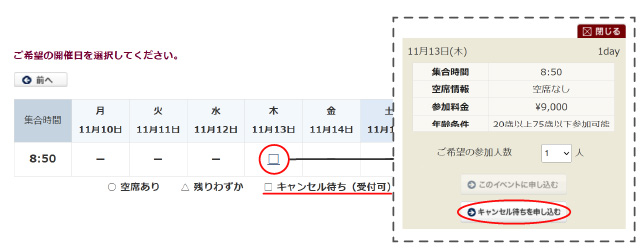 満席のイベントやツアーでも、「キャンセル待ち」でお申し込みができるようになりました。