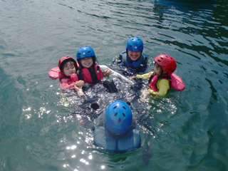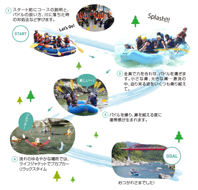 急流を下るだけではなく、ボートの上からのんびり景観を眺めたり、バランスゲームやフロートスイムなどの水遊びを盛り込み、とびきり楽しい一日をお約束します。
