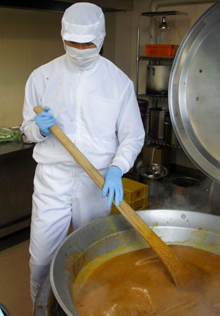 その工程は、(1)野菜や肉などをカットする下処理、(2)巨大な鍋にスパイスや調味料を入れて調合するスープ調理、(3)具の計量とレトルトパックへの袋詰め、(4)具が入ったパックにスープを注入する充填作業、(5)パックのシーティング、(6)パックの検品、(8)高温高圧調理殺菌装置によるレトルト加工、(9)X線異物混入検収器によるチェック、という流れになっています。大手メーカーの場合、スープや具の充填を機械化している場合が多いのですが、「私たちが作っているカレーは具が大きすぎるし、スープもサラサラ(欧風カレーのように、小麦粉等で固めていない)。手作業じゃないと、こんな手間ひま掛けたカレーはレトルトで作れません」とのこと。実際に食べてみると、それぞれの具材の大きさやスパイシーな香りに「これがホントにレトルトカレーなの?」と驚くほどです。