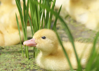 あひるの米屋は、岡山県備前市の山間の田んぼで、「アヒル農法」でお米を作っています。「アヒル農法」とは、田植え1週間後にアヒルのヒナを離し、雑草や雑草の種子・虫などを食べてもらいます。さらに田んぼの中を泳ぎ回ることで稲に適度な刺激を与え、根張りを良くするという効果があります。アヒルの排せつ物は微生物が分解し、天然の肥料となり元気な稲が育ちます。農薬や化学肥料に頼らなくても、安全でおいしいお米が作れるのです。「アヒル農法」の水田にはさまざまな水生昆虫も生息し、生物多様性の保全にもひと役買っています。天日干し乾燥のお米は、お日さまパワーもたっぷり蓄えています。また、当園の田んぼで活躍しているアヒルの品種は、肉用品種の「チェリバレー」と「新大阪」。畔草などはヤギに食べてもらって除草を行い、「ヒトにやさしく、自然にやさしい」農業を目指しています。