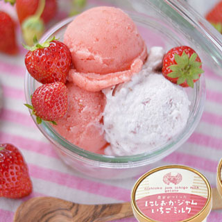 リッチなミルクジェラートに、畑直送のいちごで作った「にしおかジャム」をさっくりと混ぜ込んでできたのが「にしおかジャムいちごミルクジェラート」です。大粒いちご入りの手作りジャムは、ミルクの濃厚さにも負けない存在感があります。