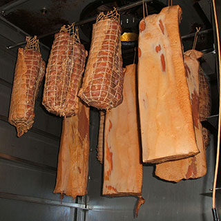 スモークハウスファインのベーコンは、良質の豚バラ肉1枚1枚に、丹念に塩と香辛料をすり込む、乾塩法という製法を用いて漬け込まれています。2週間かけて余分な水分を抜き、じっくりとスモークさせたベーコンは、肉の味が凝縮した深みのある味になります。一般的な製法の何倍も手間がかかり、技術も必要ですが、「生産性を重視するのではなく、本当に美味しいを食べてほしい」と、ファインではこの製法を守り続けているのです。
