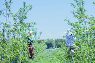 りんご栽培では、袋を身にかける有袋栽培と呼ばれるものがあります。これはりんごを「きれいに・まんべんなく」着色させられる栽培方法ですが、それではりんご自体に当たる日照量が減り、味が落ちてしまいます。当農園では見た目以上に味にこだわり、30年以上前から袋をかけず栽培しています。