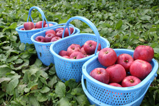 おいしいりんごをお届けするために完熟収穫をします。おいしさの指標である完熟状態での収穫を優先し、1個1個完熟状態を確認しながら収穫しています。