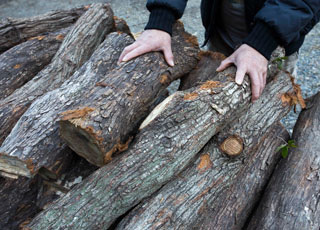 近年、ウバメガシは深刻な森林害虫キクイムシの食害を受けています。マルモ製炭所の周辺には豊富な原木が自生していていますが、良い原木だけを使い、古い原木を放置することは、キクイムシの増殖につながります。食害を受けた太い木を薪として利用することは、森を守ることにつながります。ウバメガシの薪は、備長炭の原木が生える森を大切したいという気持ちから生まれた産物なのです。