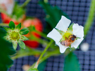 また、おいしいイチゴを栽培するため、そして地域に貢献するため、他にはない取り組みもされています。まず1つは、ミツバチによる自然受粉。より自然に近い状態で、果実を傷付けることなく受粉ができるだけでなく、地元の養蜂企業と連携することで、「自然」を産業に変え、中山間地の新たなビジネスモデルとして世界に発信することを目指されています。