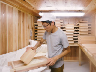 藤原さんの味噌作りは天然醸造という製法です。添加物を加えず、温度・湿度も自然の流れにまかせながら、酵母菌の力だけで、1年以上じっくり熟成させます。「ここはこうしておけばよかった」と思っても、次の仕込みに反映させ、その答えがわかるのはまた1年半後。出来上がりまでが長い分、仕込んだについて味噌考える時間も比例して長くなるそうです。藤原さんは「思いが詰まった味噌の木蓋を開ける瞬間はたまりません。」と言います。味噌が大好きな藤原さんが、思いをこめて作ったお味噌をぜひご賞味ください。