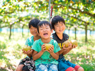 私たちは、「梨作りが人の輪作り」、「梨でおもて梨」の理念に基づき、お客さまとお付き合いさせていただいています。この二つの言葉には「人との関わりが好き」「みんなに喜んでもらうのが好き」そして梨のおいしさや収穫の喜びなどの「農業の魅力を伝えたい」という気持ちが詰まっています。