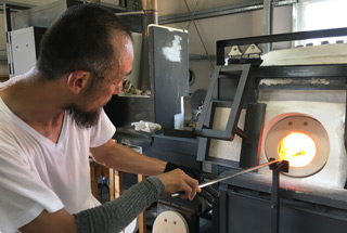 そしてガラスに触れた瞬間に惚れ込み、大学卒業後は富山市立富山ガラス造形研究所に進学。研究所在学中はシアトルから客員教授として来日していたBrian Pike氏に師事。卒業後は、ガラス作家・大村俊二氏に師事。その後もEZRA GLASS STUDIO、富山ガラス造形研究所助手、西中千人氏の制作アシスタントなどを経験し技術を学び、2010年に夫婦で工房を設立。
