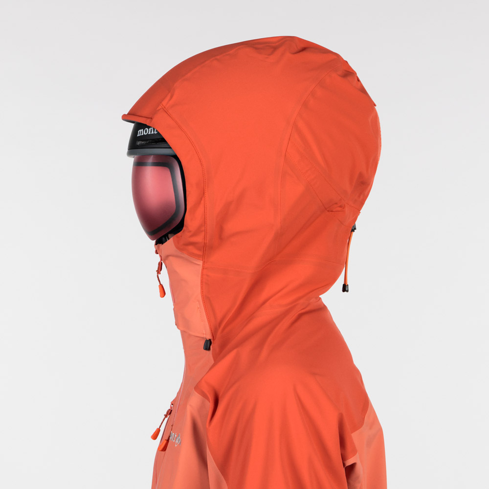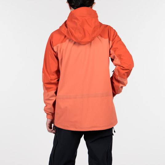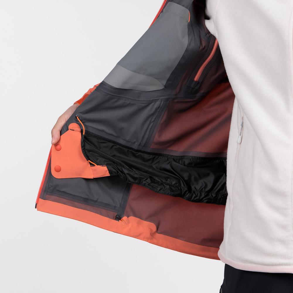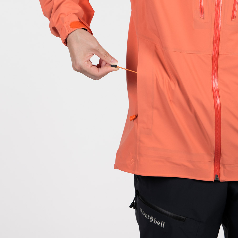 | 特長 | トライアクスルフード / フィット感を高める独自の立体フードパターン / 高めの襟元 / ジッパーが顔に当たらない仕様 / 立体裁断(肘) / アルパインカフ / アクアテクトジッパー / エアレーションシステム / スムースピットジップ / 滑り止め付きウインドスカート / 裾の調節は前身頃内側 / リフト券やICチップを入れられる左袖のポケット / 取り外して洗濯できる口元パーツ / 薄くて軽量な13mm幅のシームテープ / 1WAYストレッチ / スタッフバック付き |