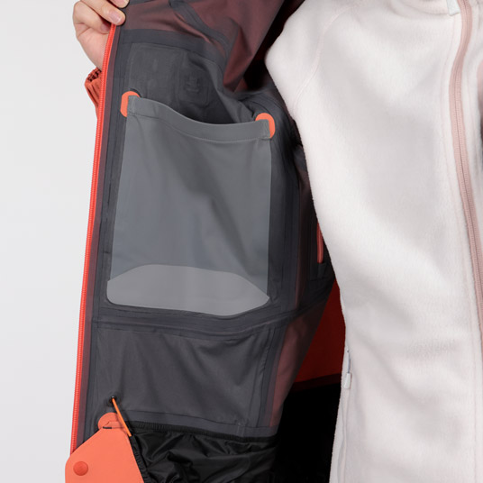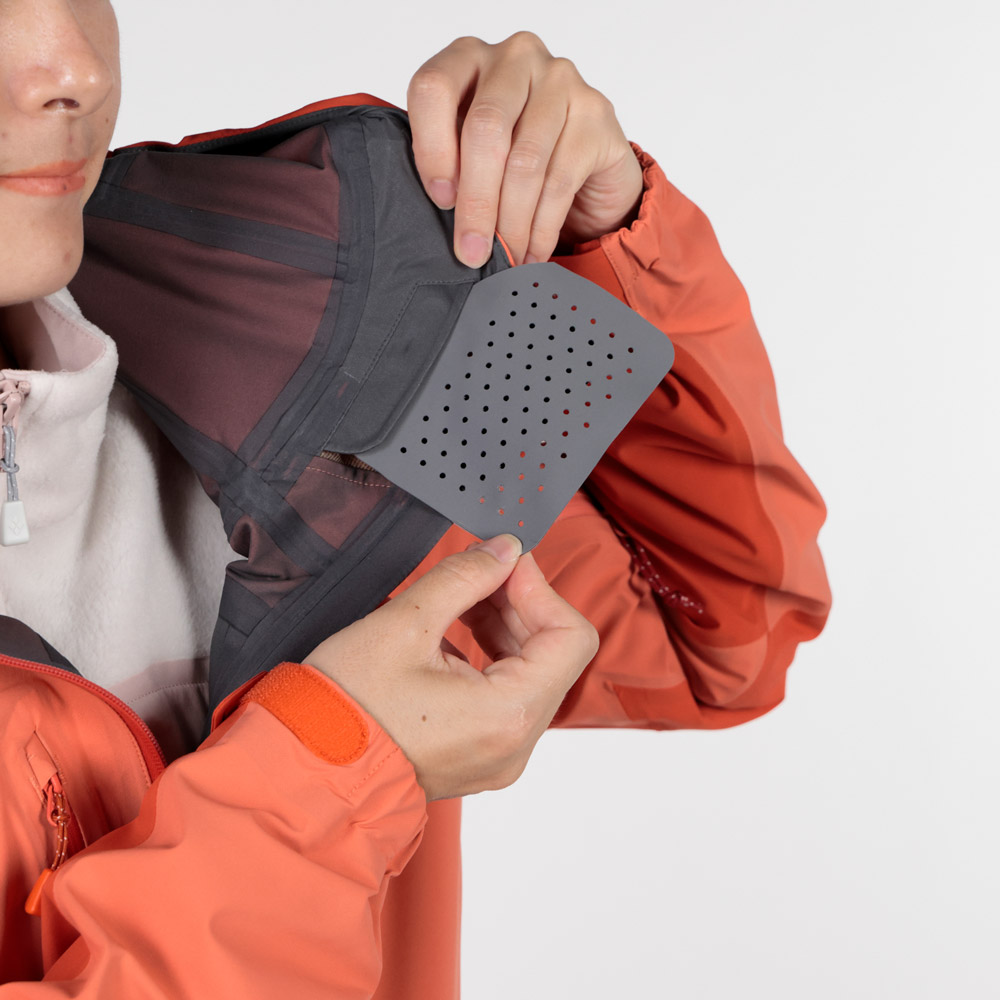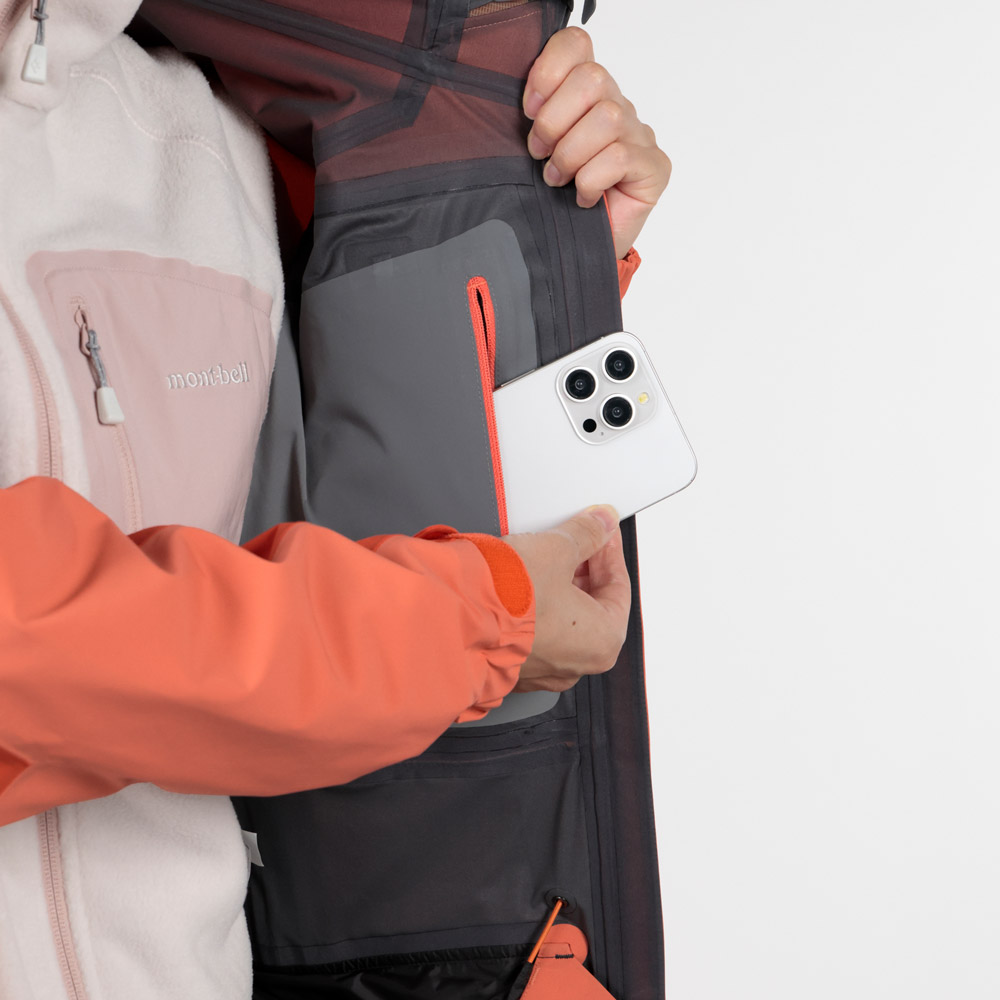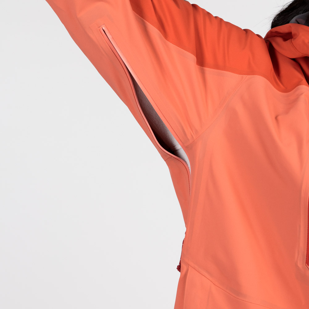 | 特長 | トライアクスルフード / フィット感を高める独自の立体フードパターン / 高めの襟元 / ジッパーが顔に当たらない仕様 / 立体裁断(肘) / アルパインカフ / アクアテクトジッパー / エアレーションシステム / スムースピットジップ / 滑り止め付きウインドスカート / 裾の調節は前身頃内側 / リフト券やICチップを入れられる左袖のポケット / 取り外して洗濯できる口元パーツ / 薄くて軽量な13mm幅のシームテープ / 1WAYストレッチ / スタッフバック付き |