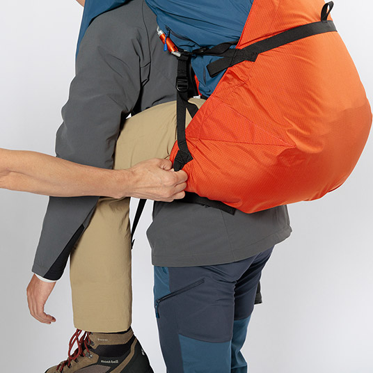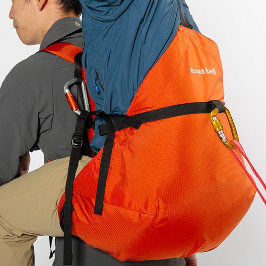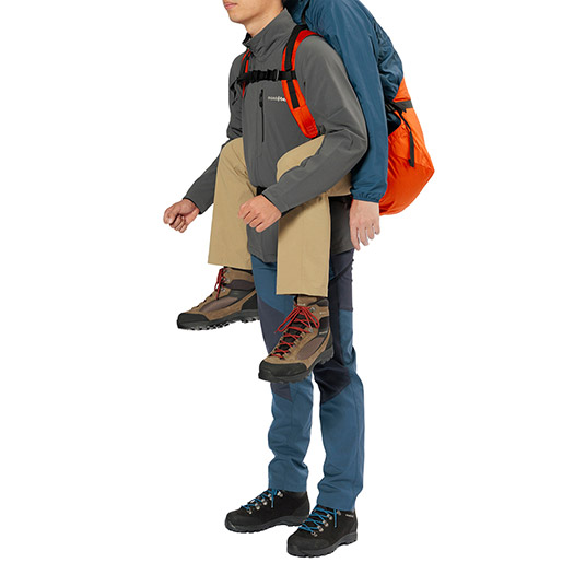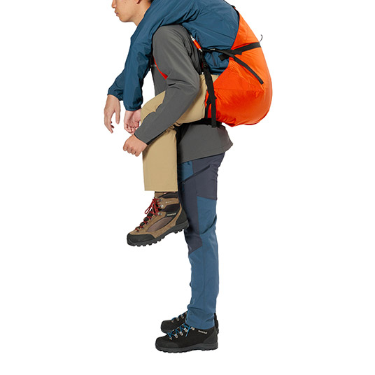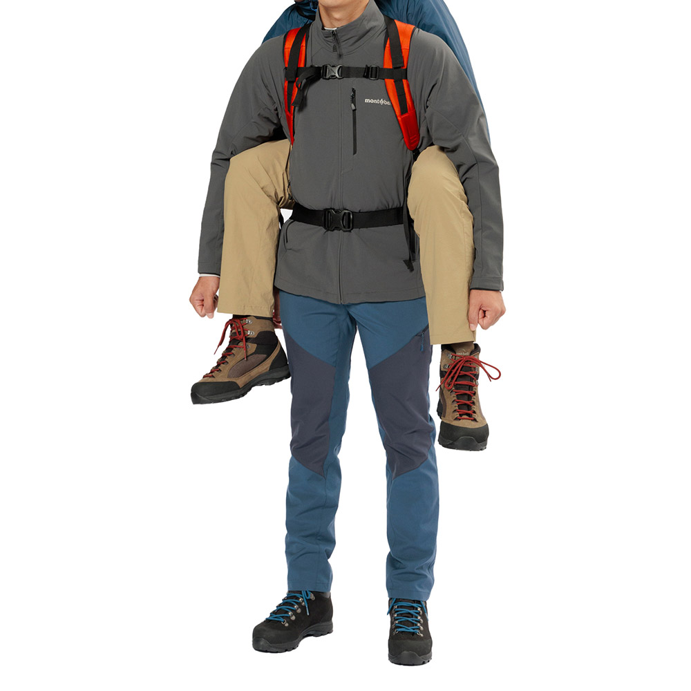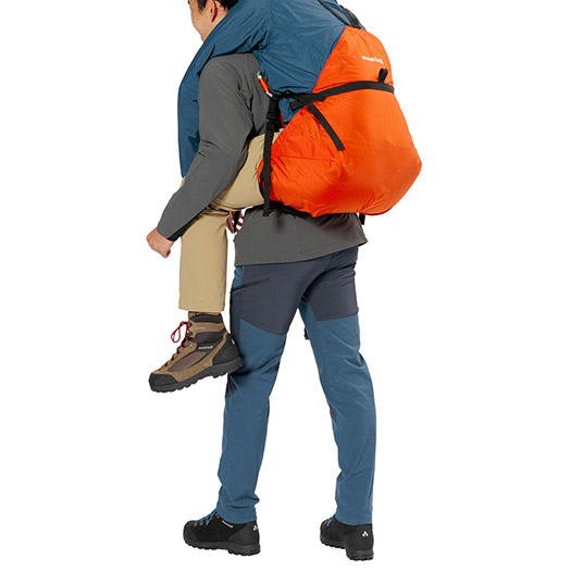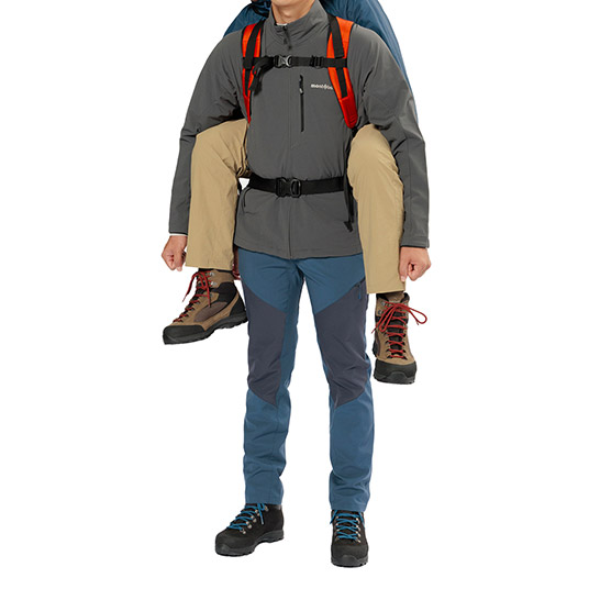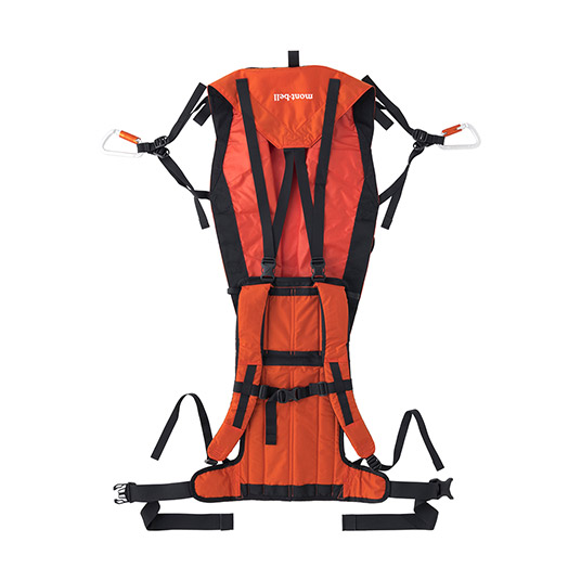 ケガや体調不良により、歩行が困難になった人を背負って救助するための背負搬送具です。独自の袋状の構造は要救助者を無理のない姿勢で背負うことを可能にします。ヒップベルト一体型のフレーム入り背面パッドが、搬送者(背負う人)にかかる荷重を分散し、負担を軽減します。搬送時に両手が自由になるため、安全な移動が可能です。専用のスタッフバッグが付属し、軽量コンパクトに収納できるため、山岳救助だけでなく、災害や震災時の備えとしても役立ちます。