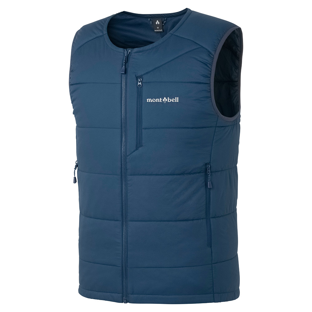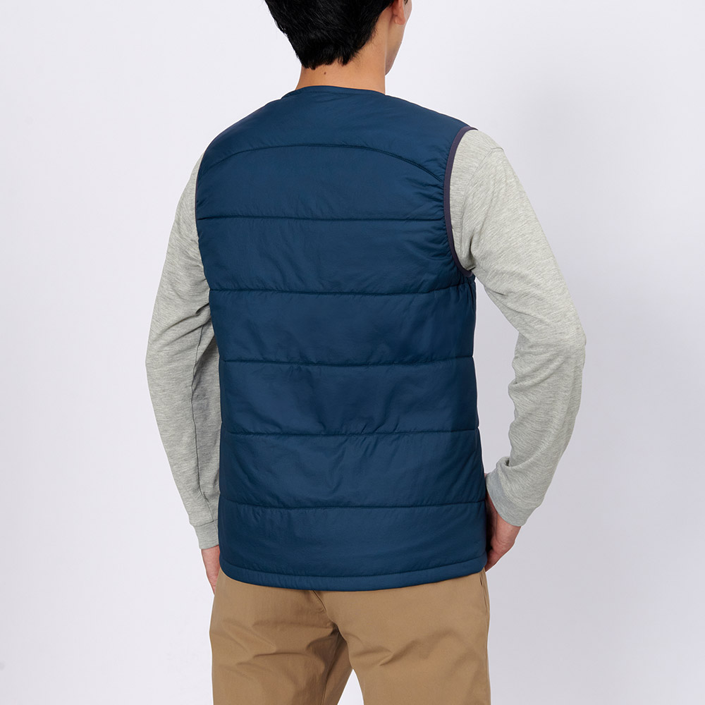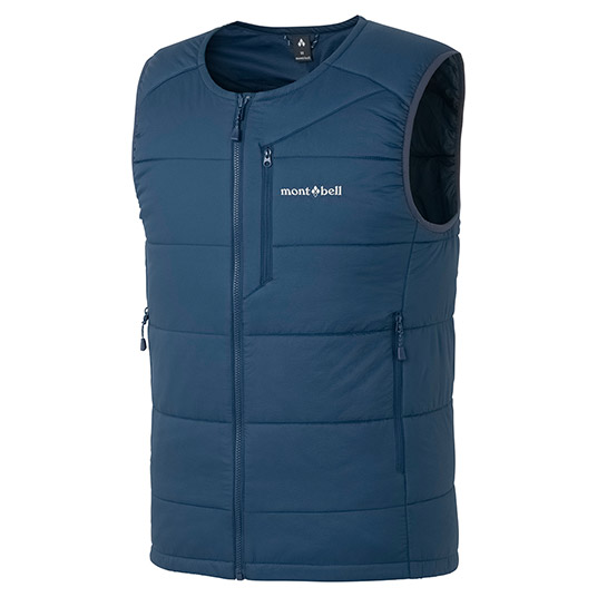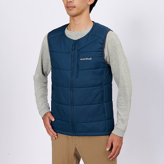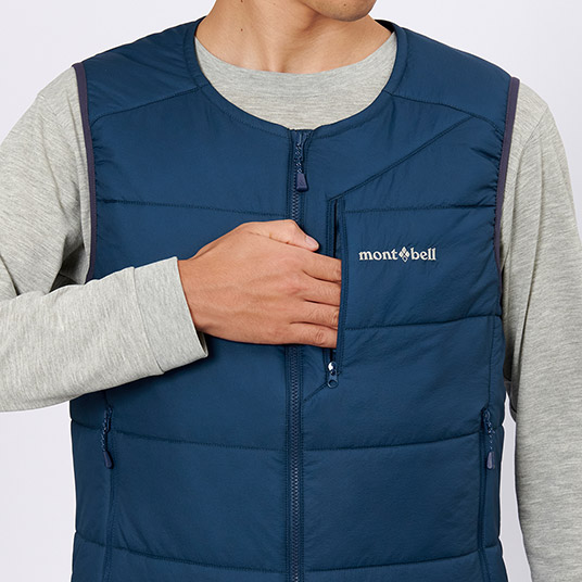 保温性と運動性を兼ね備え中間着として着用しやすいベストです。アウターの襟元と干渉しにくい丸首タイプです。