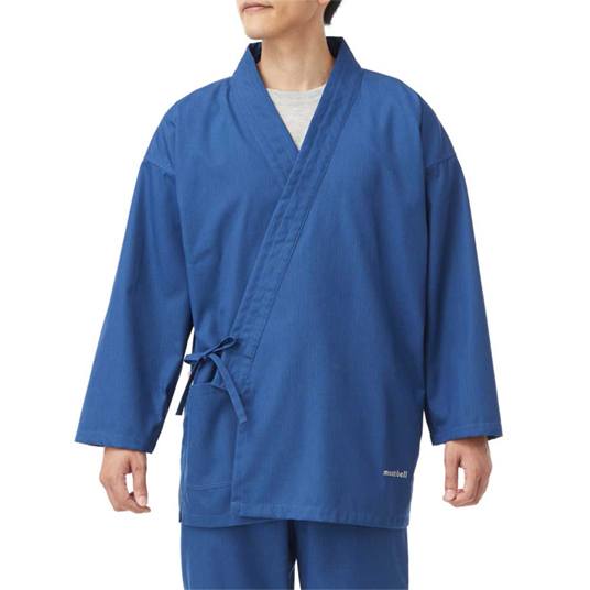 日本古来の「作務衣(さむえ)」をモンベルが独自に開発した難燃性素材フレアテクト®で作りました。野外での調理やたき火などで火の粉を受けても、穴があきにくくなっています。コットンのような自然な風合いと適度なハリを持ち、ゆったりとした着心地で、リラックスウエアや作業着として活躍します。前身頃はひもで結んで留めるシンプルな仕様です。ポケットは合わせの内側にあるため、内容物が落ちにくくなっています。袖口は簡単に絞ることができ、バタつきを抑えられます。※火から完全に身を守るものではありません。