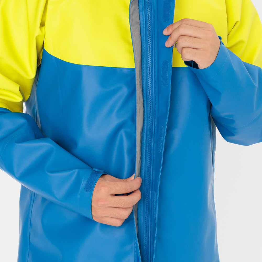 防水性に特化した一般的な漁業用ウエアに比べ、蒸れを放出する優れた透湿性と防水性を兼ね備えた汚れに強いウエアです。生地の表面に汚れにくい防護膜を備えた4層構造の防水透湿性素材ドライテック生地を使用。ハードな使用にも対応可能な耐摩耗性を実現しています。長年のレインウエア開発で培われた、浸水を防ぐ独自の機能を備え、漁業の現場で高いパフォーマンスを発揮します。すっきりとしたシルエットながらも、厚手のインナーを重ね着することができます。